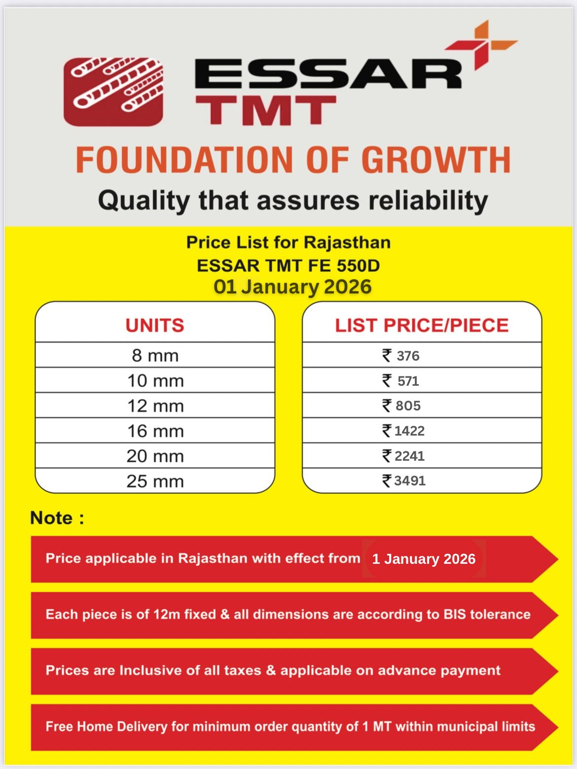 Essar TMT 550D is a trusted name in the supply of TMT bars and structural steel products in Rajasthan. With a focus on delivering high-quality materials for the construction and infrastructure sectors, we have earned a reputation for reliability and consistency in the region.